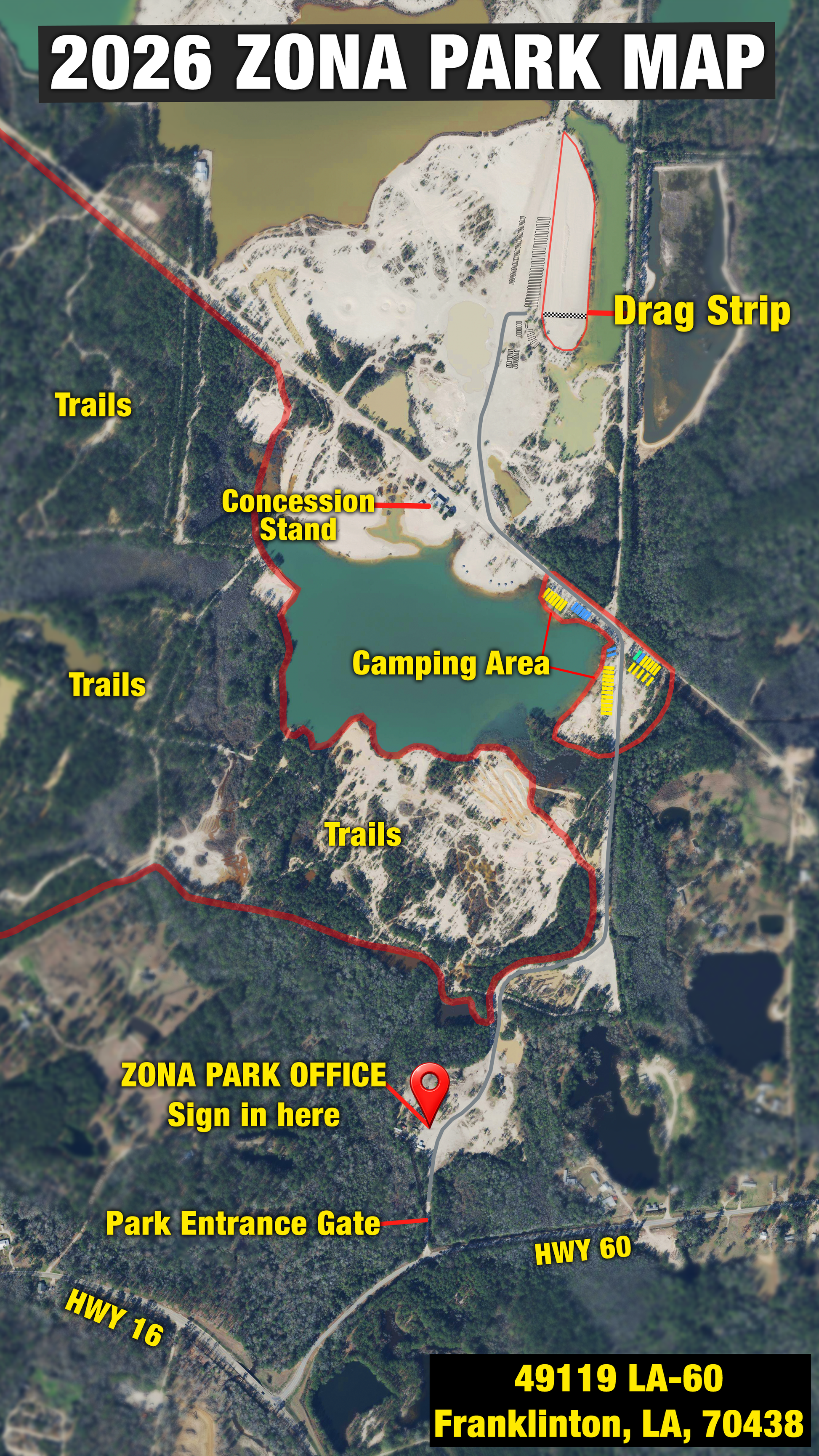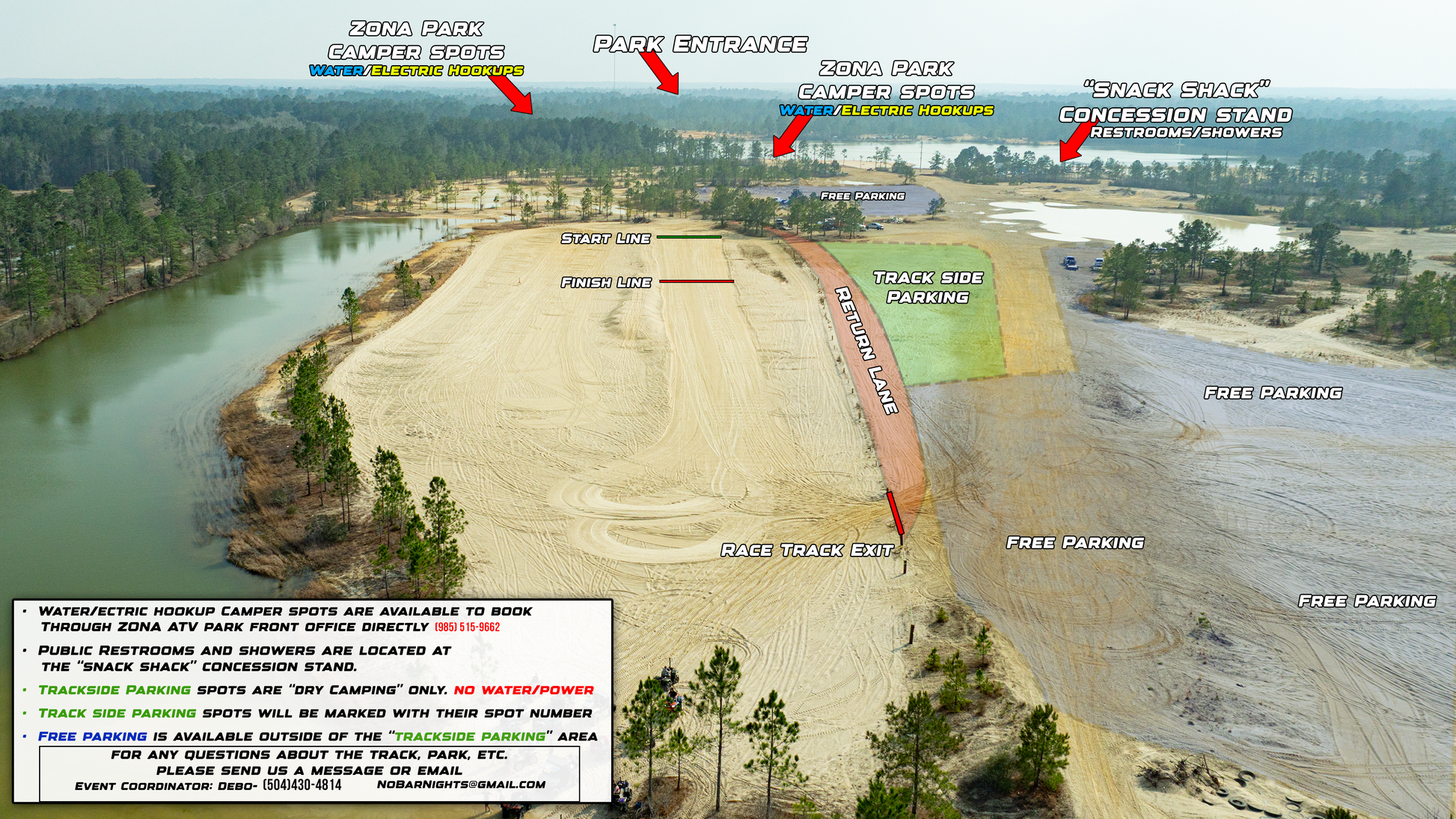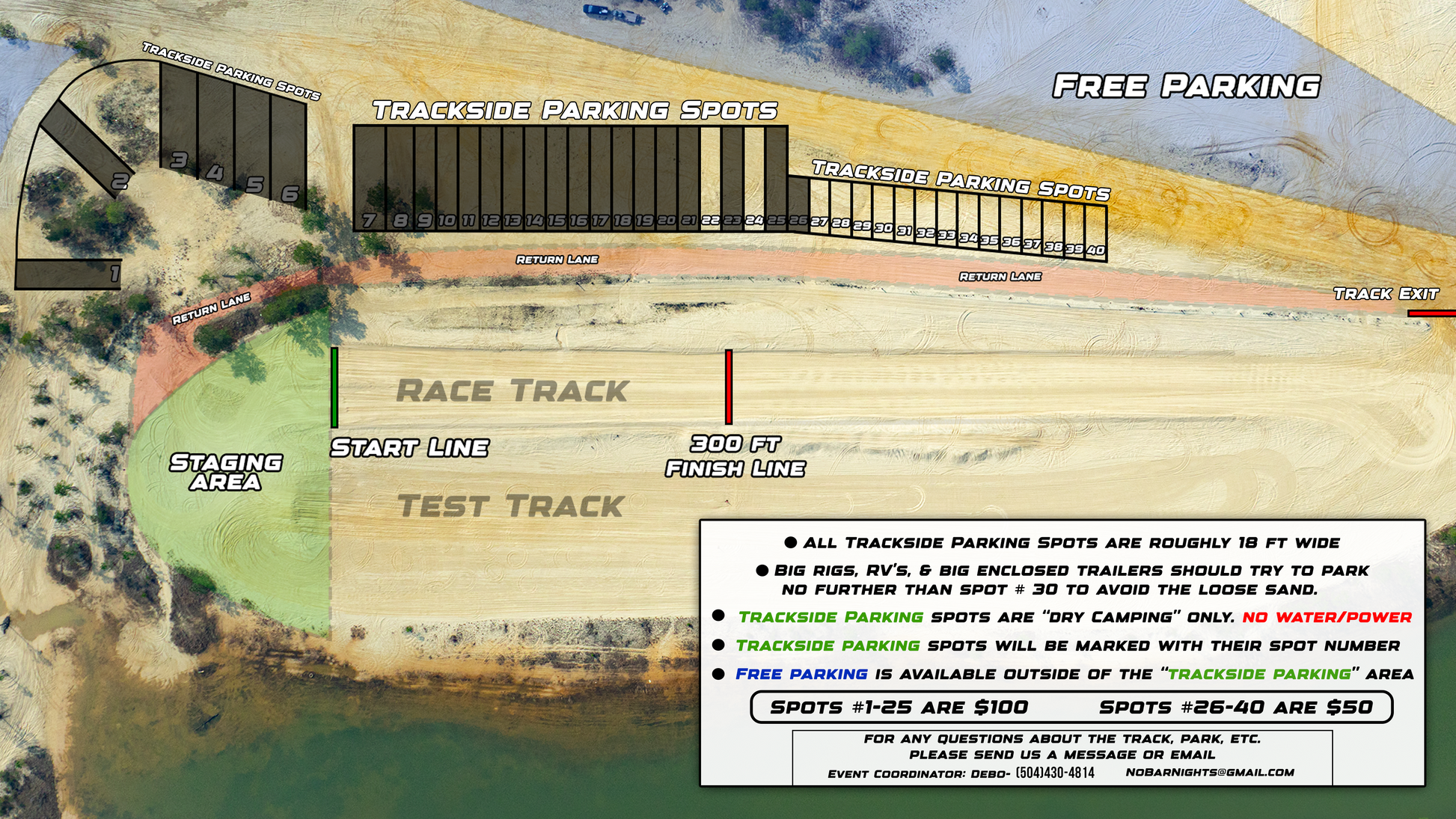 - Big rigs, RV’s, & big enclosed trailers should try to park no further than spot # 30 to avoid the loose sand.