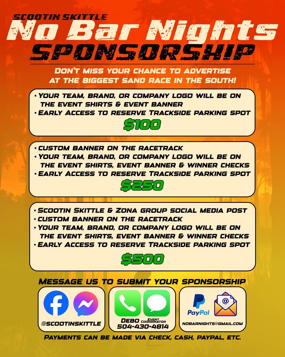 SPONSORS HAVE FIRST DIBS. IF YOU WOULD LIKE TO SPONSOR THE RACE TO RESERVE YOUR SPOT EARLY, SEND US A MESSAGE.