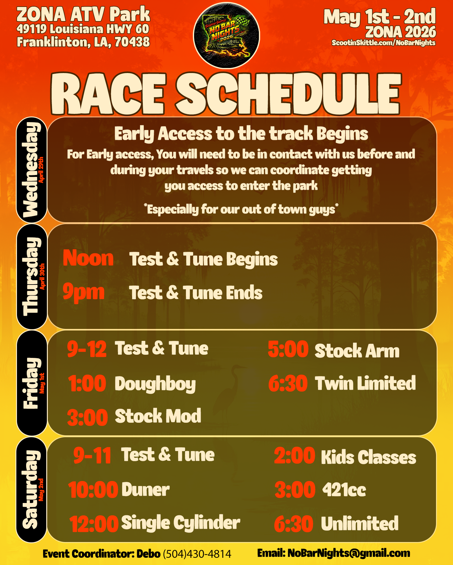 EARLY ACCESS TO THE TRACK BEGINS ON WEDNESDAY 4/29. Test&Tune on thursday. Races happen on friday and saturday.